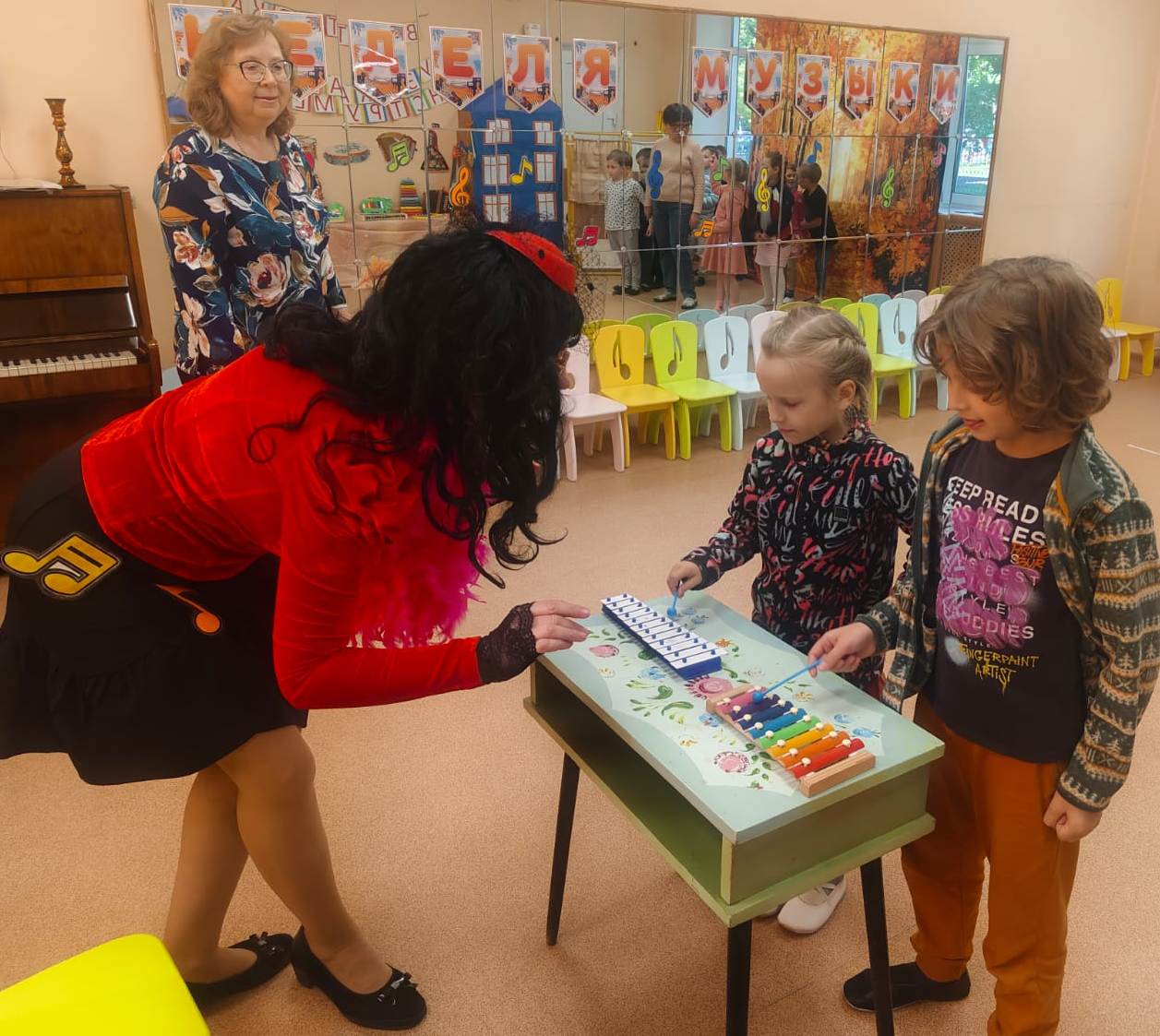 Весело и интересно для детей прошли развлечения. К детям приходили необычные сказочные герои Фальшивя Нотка и Кот Музик. Дети с ними играли, пели песни, танцевали, а также научили их игре на металлофоне.
