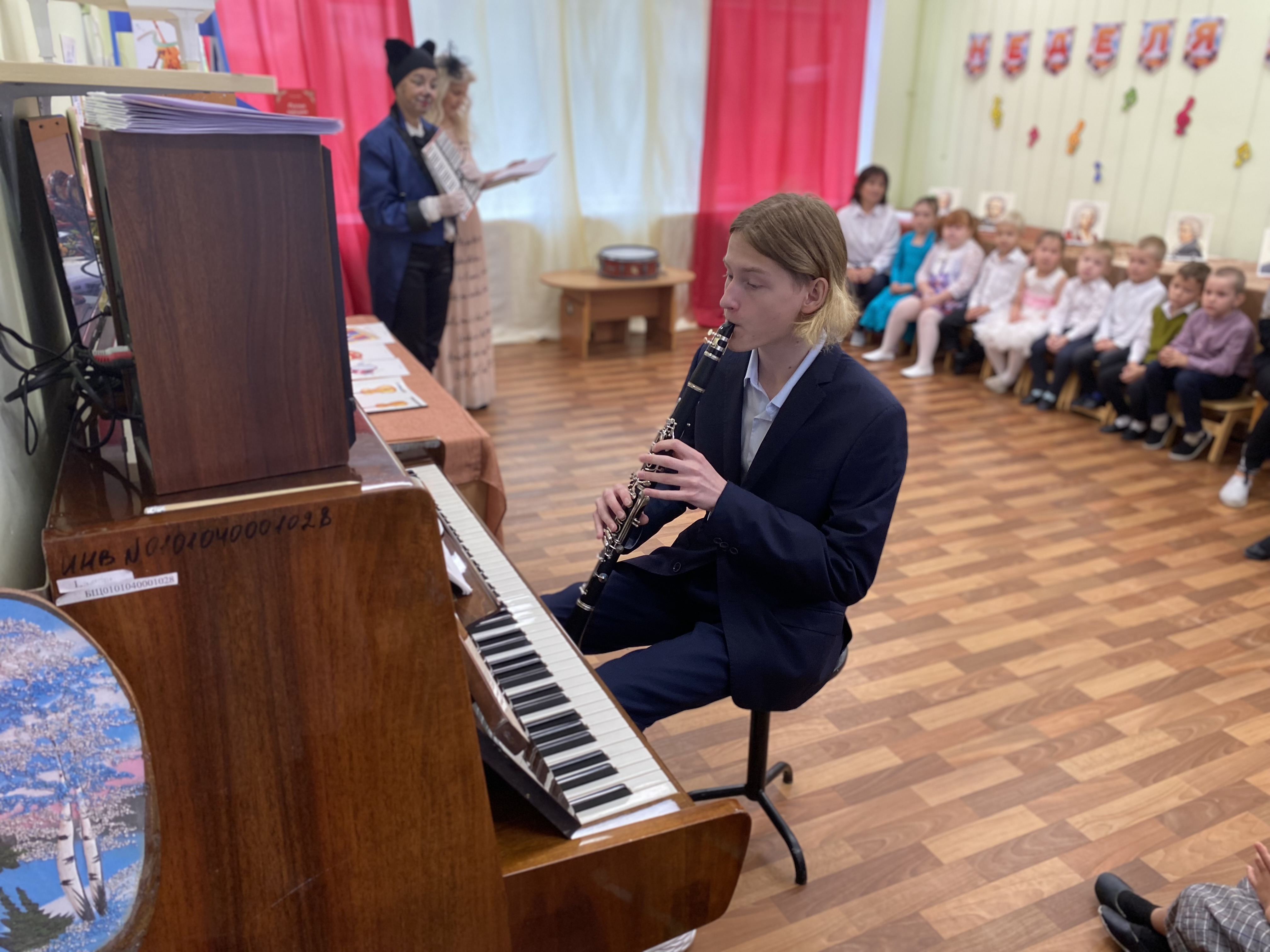 На концерте для детей детского сада выступили ученики лицея №393. Они исполнили музыкальные произведения на гитаре, фортепиано, флейте, кларнете. Дети слушали и смотрели выступления с большим интересом. Особенно понравилось детям выступление десятиклассника Егора, который показал, как устроен кларнет и замечательно исполнил на нём «Маленький концерт» композитора Дариуса Мийо.