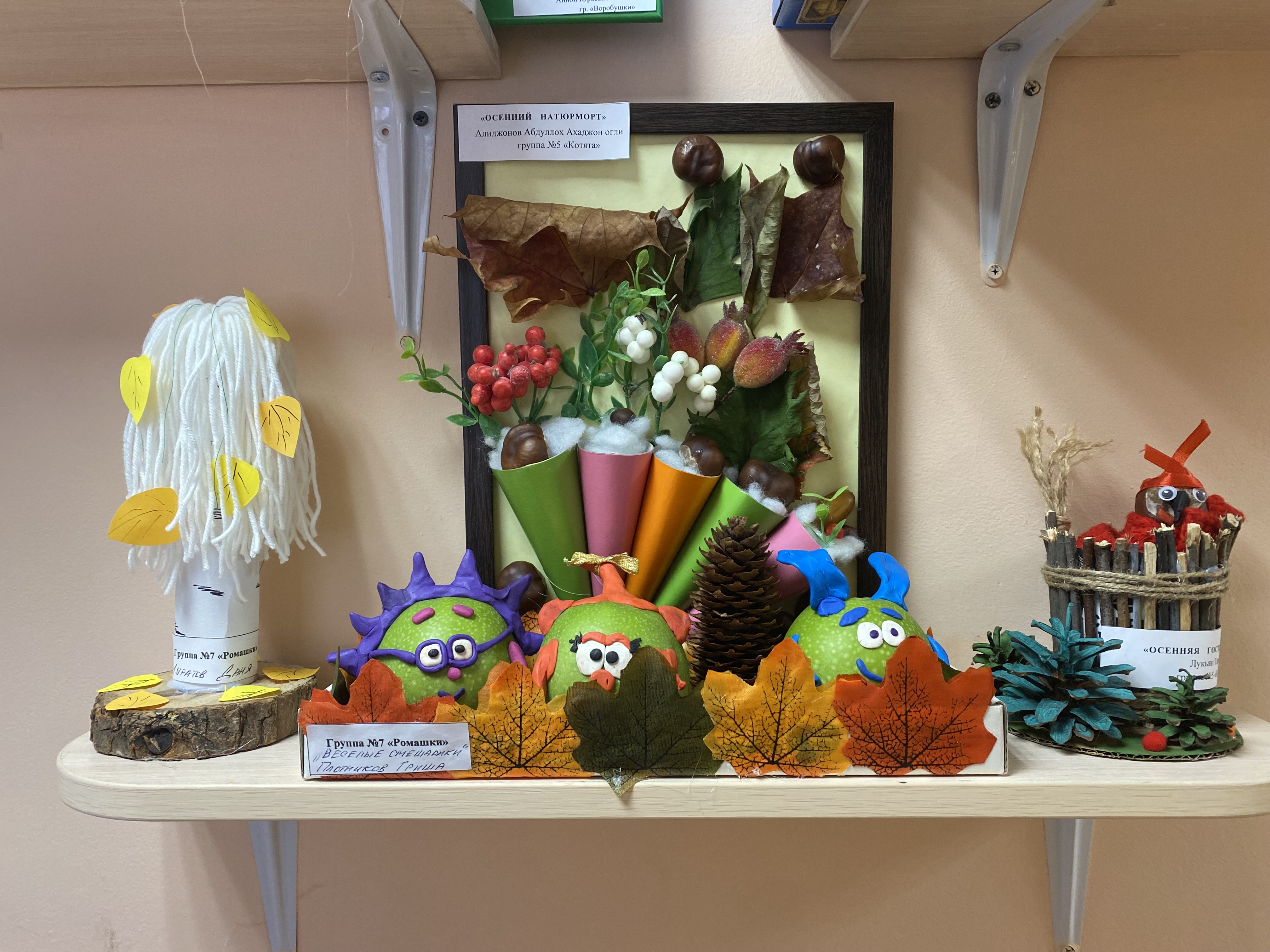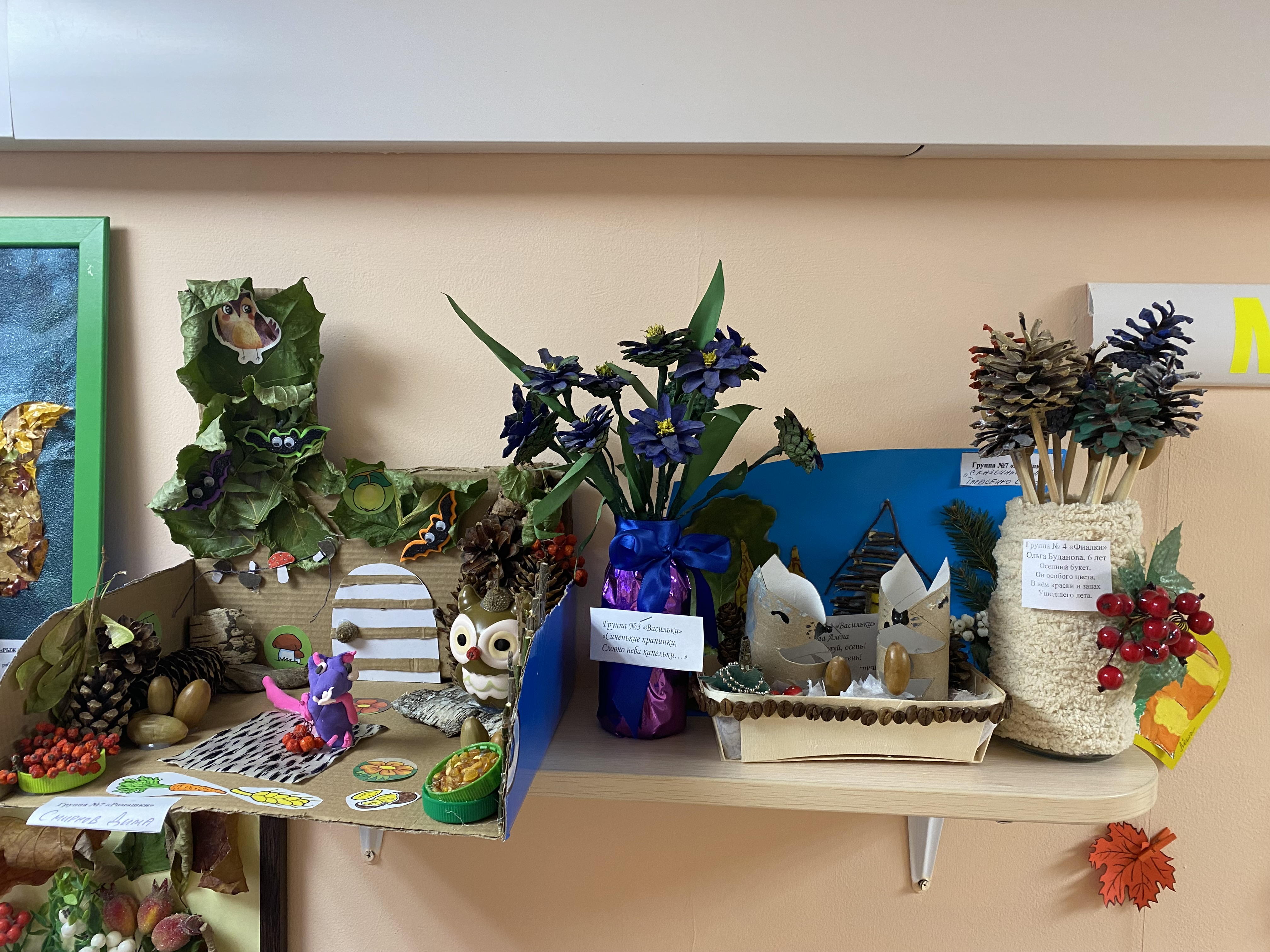 Традиционно в нашем детском саду проводятся выставки детского творчества. Не прошла стороной и чудесная пора Осени, которая вдохновляет своей яркостью и пестротой красок на воплощение прекрасных творческих идей. С 12 октября в нашем детском саду проходила выставка поделок из природного материала «Осенние фантазии». На выставке представлены работы детей, созданные совместно с родителями и педагогами. Для создания неповторимых шедевров использовались дары осени – овощи, фрукты, сухоцветы, шишки, мох, ягоды. В каждой работе прослеживается творческая индивидуальность и фантазия каждого ребенка. Все работы оригинальны, неповторимы и интересны! Дети группы «Васильки» с большим интересом посетили выставку, отгадывали загадки, придумывали названия для экспонатов, окунулись в чудесный мир осенних фантазий!